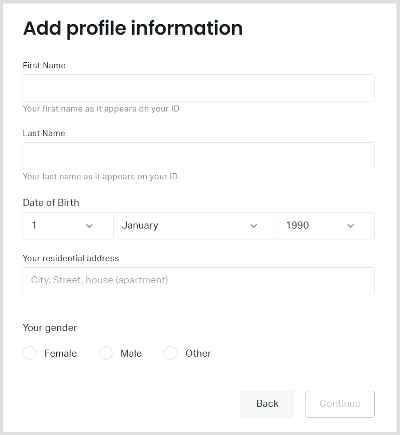 Fill in your First Name, Last Name, Date of Birth, Current Residential Address, and Gender, then click “Continue” to move forward.