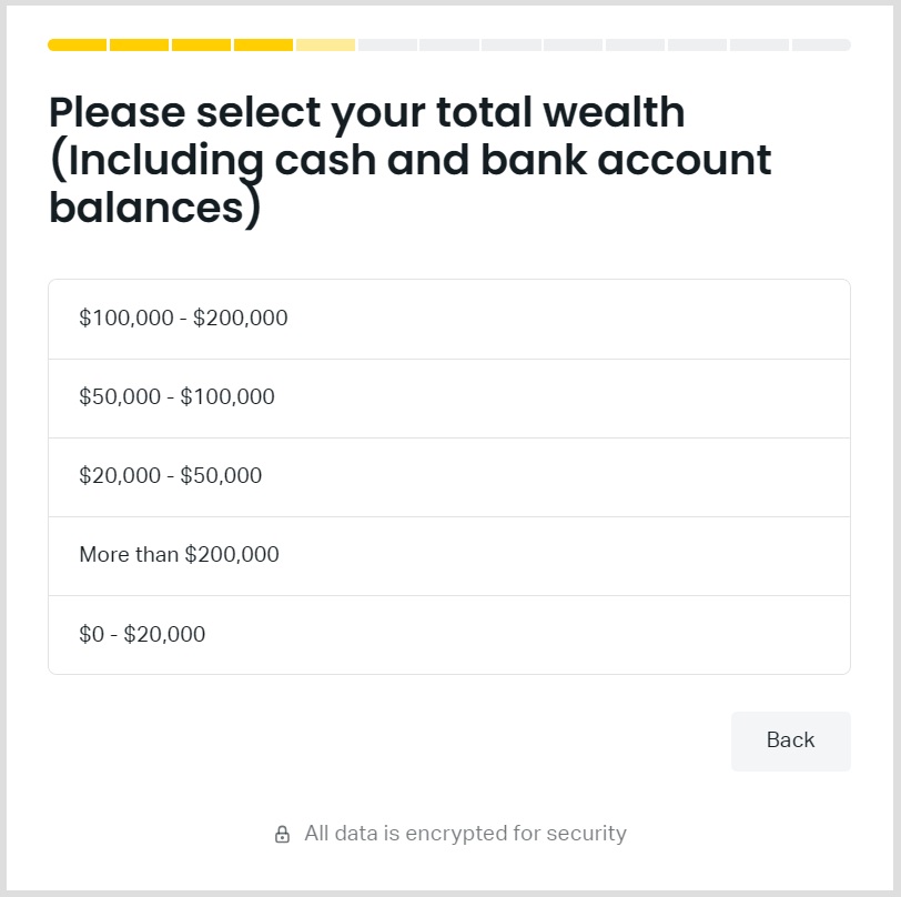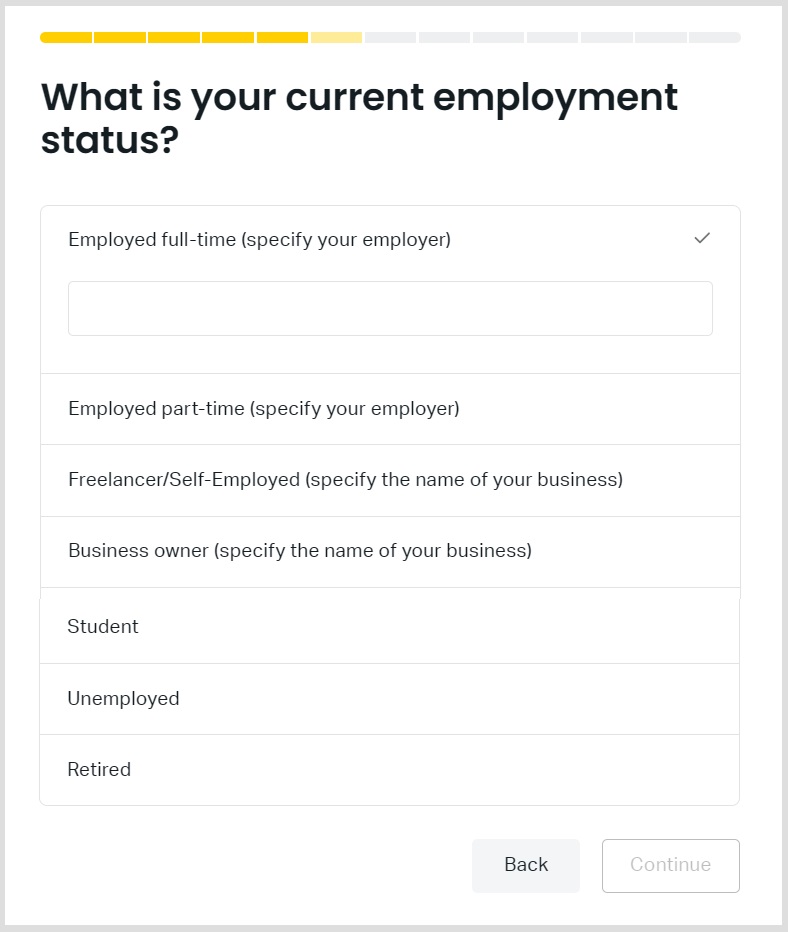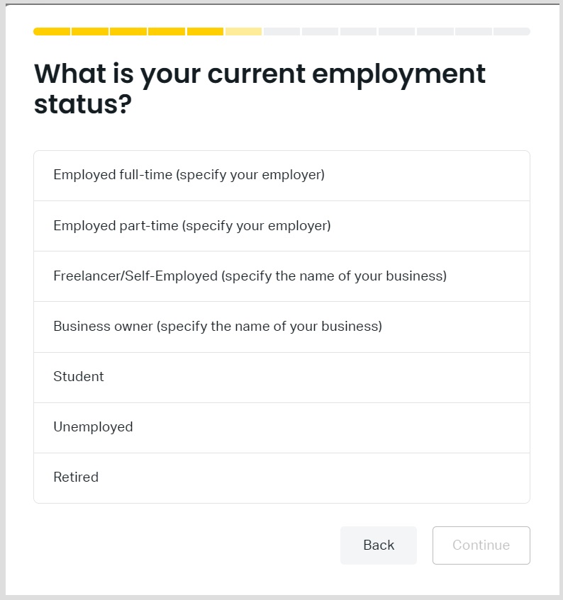 Please respond to the questions regarding your financial status, including your employment situation and trading experience.