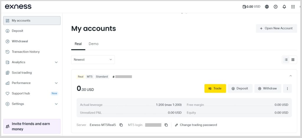 By default, an MT5 live and demo trading account will be created for you. However, you can open additional accounts anytime by clicking on the “New Account Opening” button.