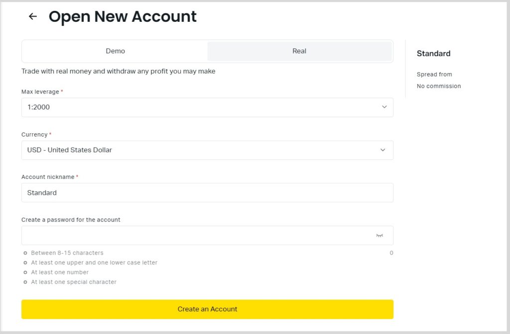 Choose your preferred account settings, such as leverage, account currency, and other options.